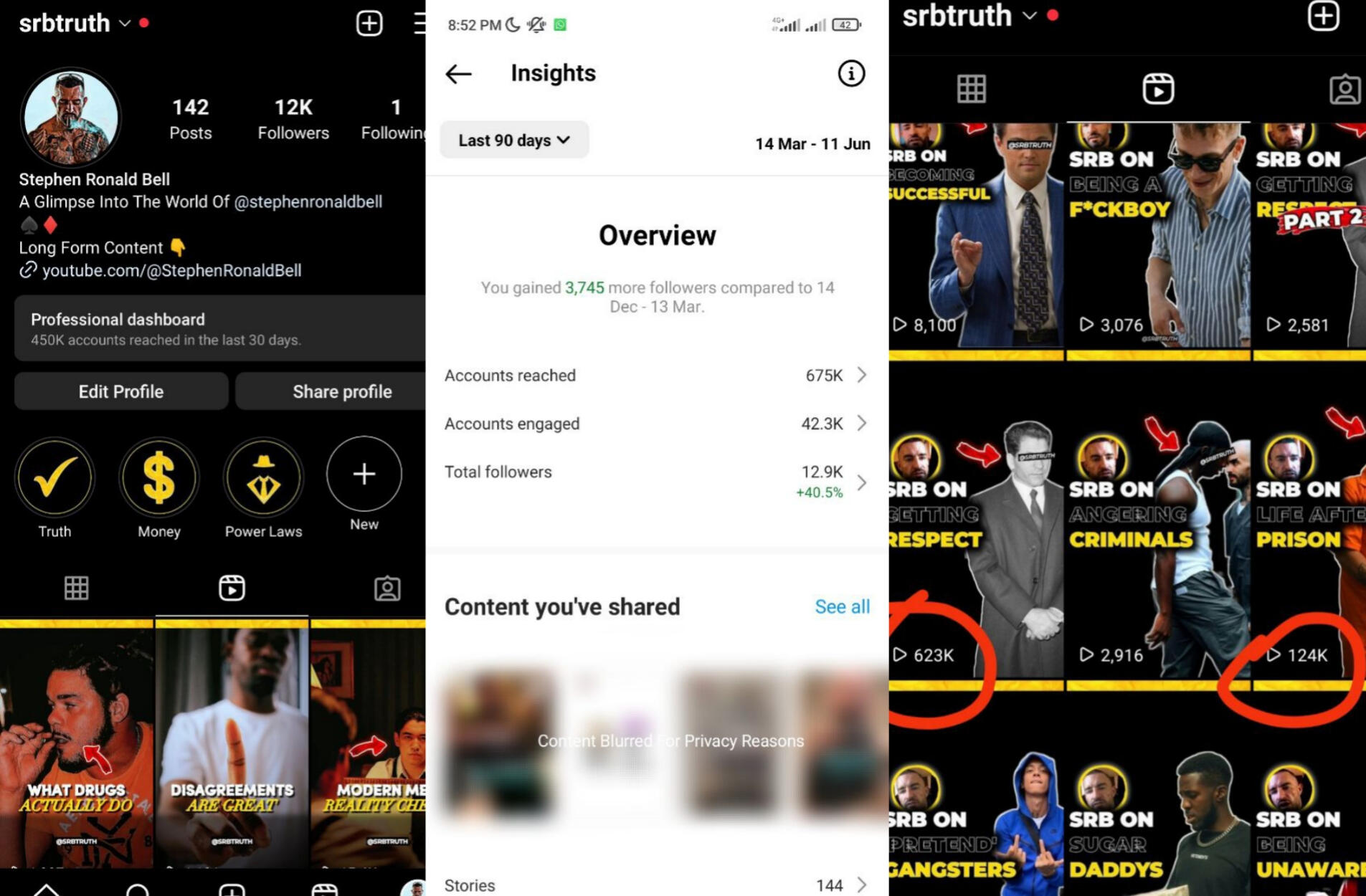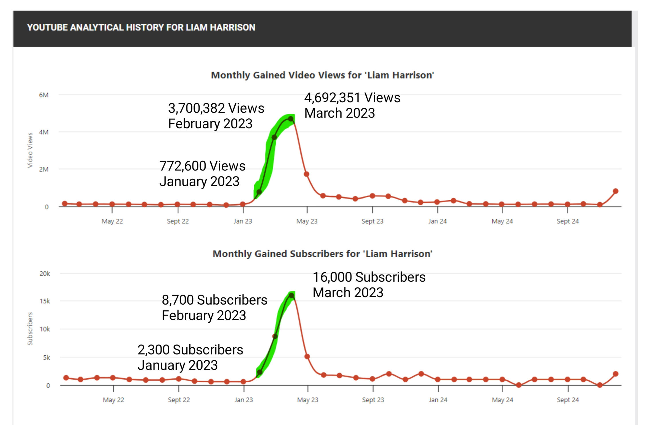 Followers Gained: Over 122.7K+ FollowersClients Information & Example Videos:We edited this client's videos over the course of 2 to 3 months, from late January 2023 till March of 2023.Using our industry leading strategies & unparalleled editing skills, we got a total of 20.99M views, with 4.9M views coming from Instagram, 12.8M views coming from TikTok and 3.3M views coming from YouTube.We made a total of 19 videos for Liam, and achieved an average of 1,103,500 views per video.Screenshot 1 shows that Liam gained the most views and subscribers in the duration we worked together (highlighted green), similar and or better growth was achieved on his TikTok and Instagram page.Below, are just some of the videos we created to achieve the best possible results during the campaign.We have also attached playlists that compiles every video we made, for each of his social media accounts below.